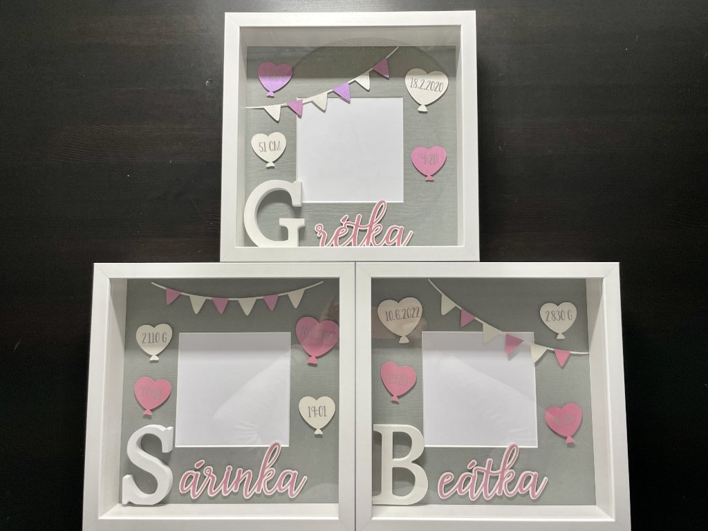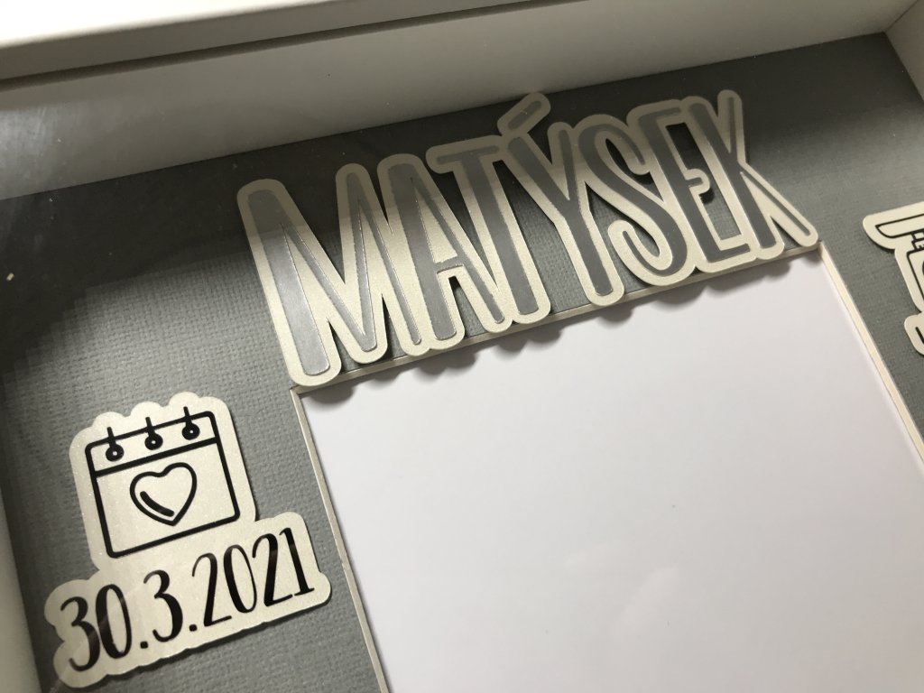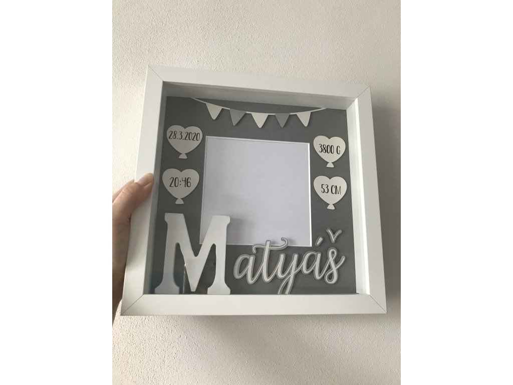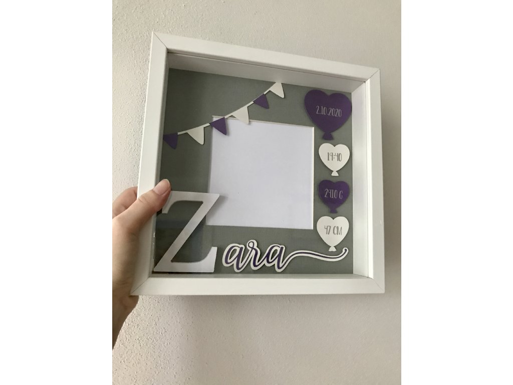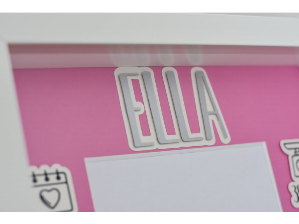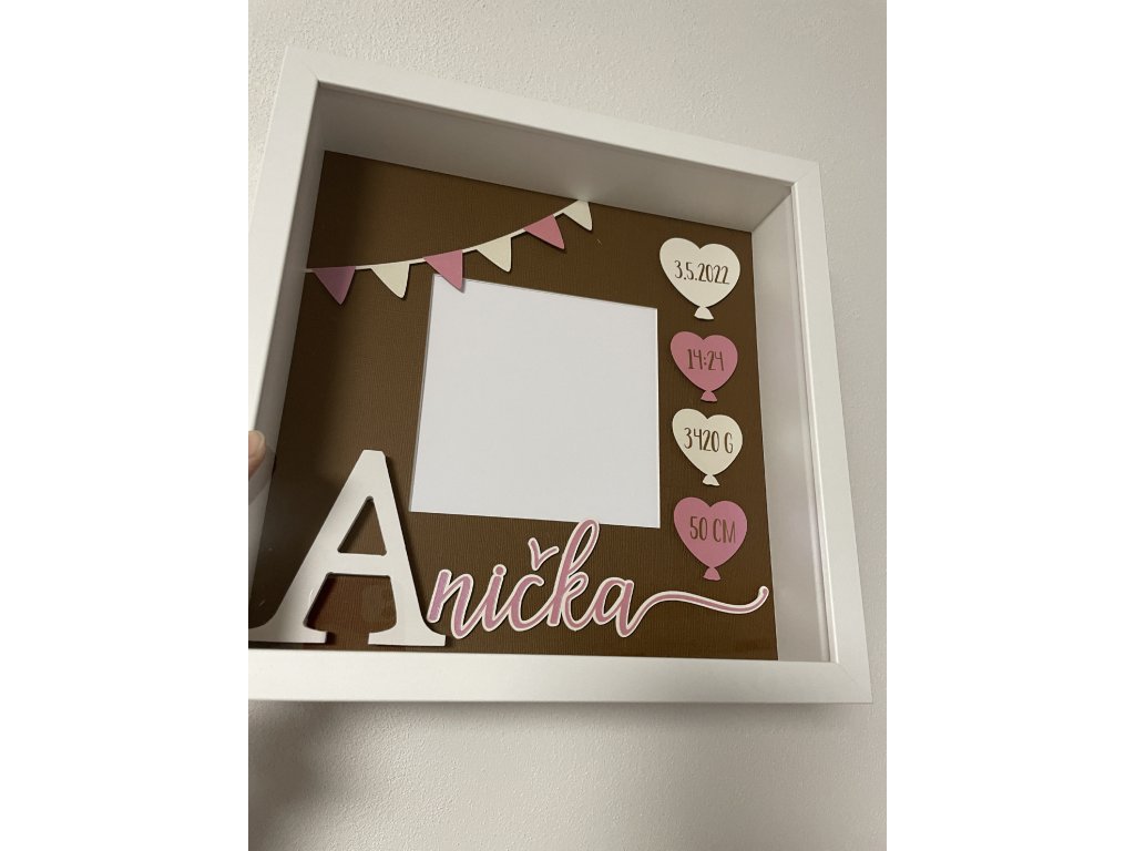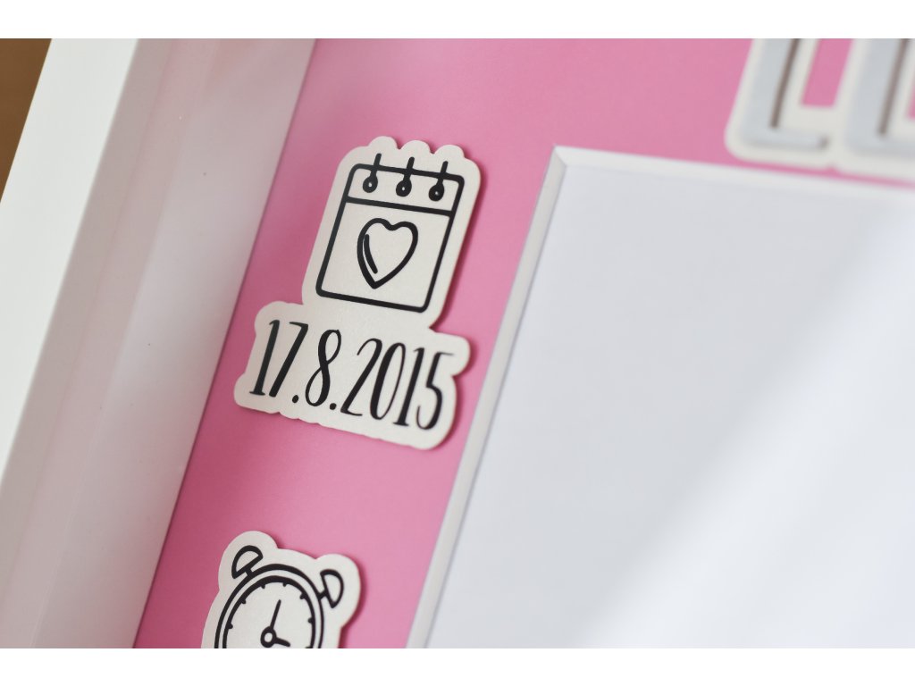Dekorace do dětského pokoje, rámeček se jménem a daty narození.