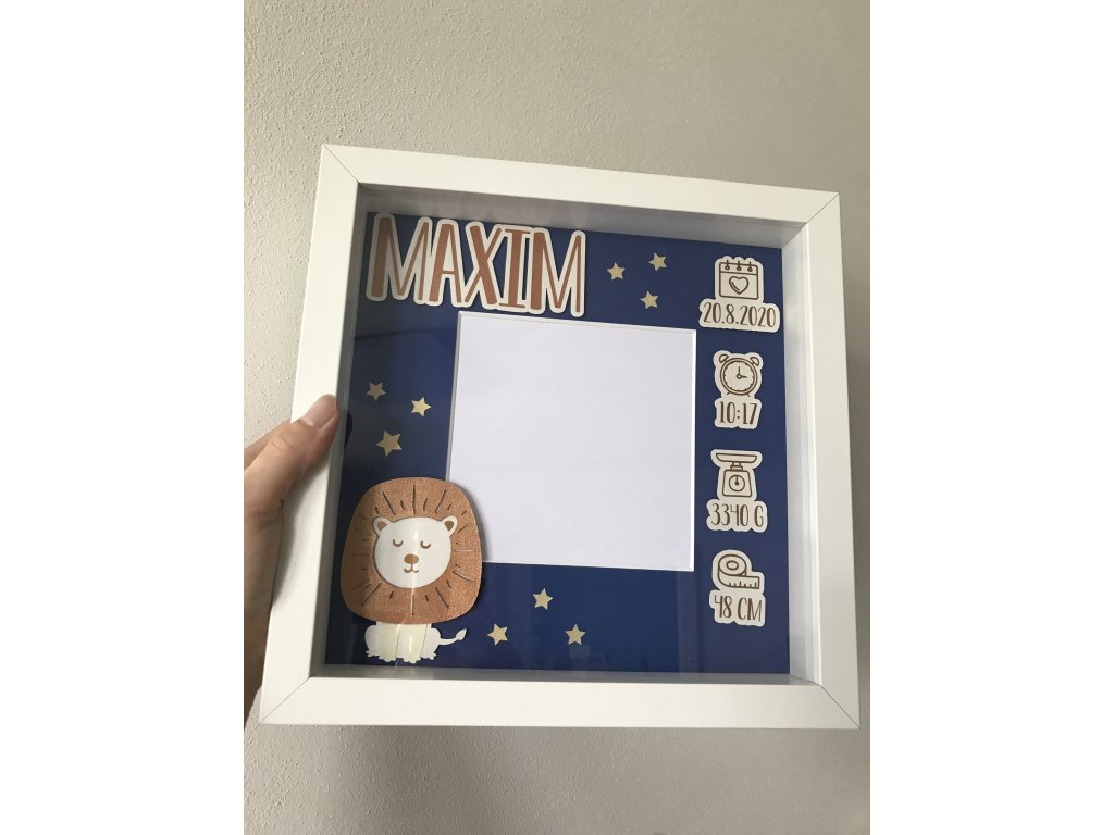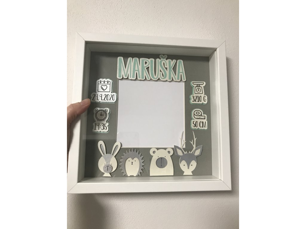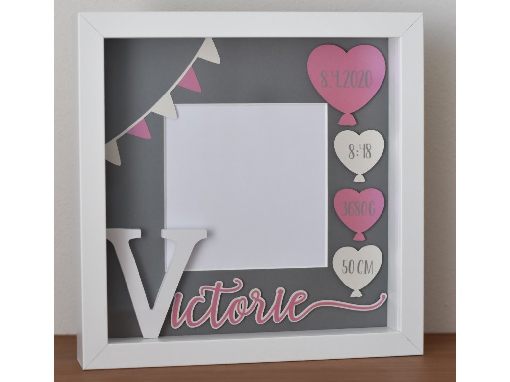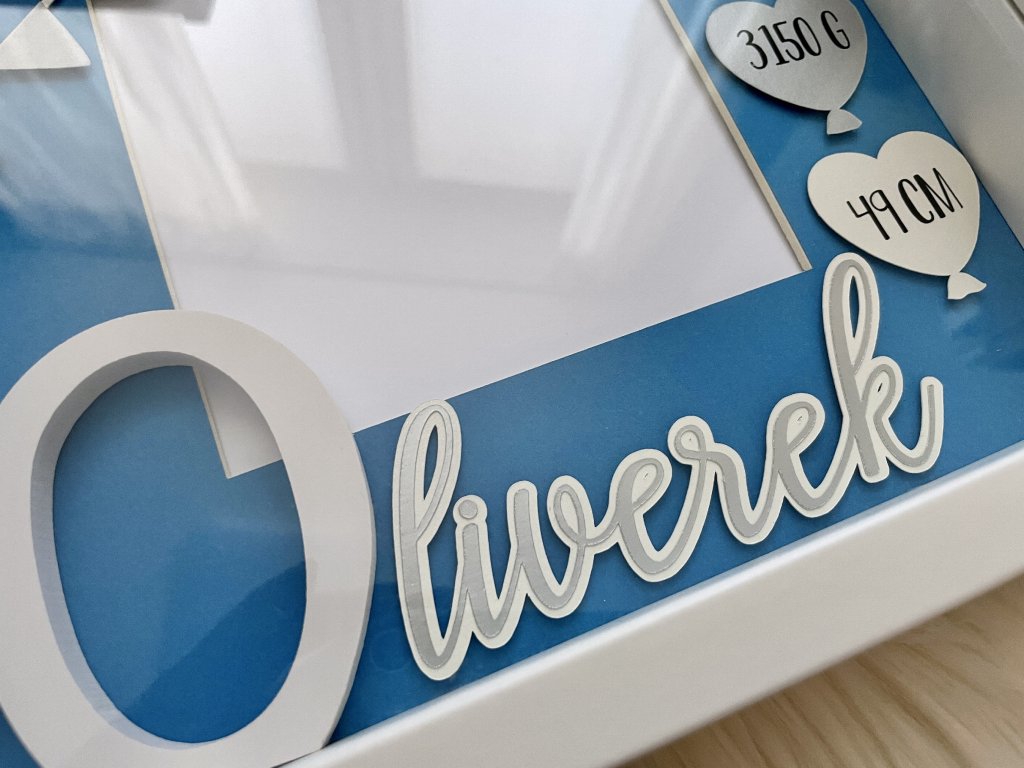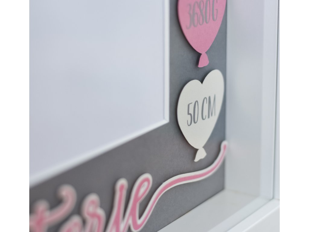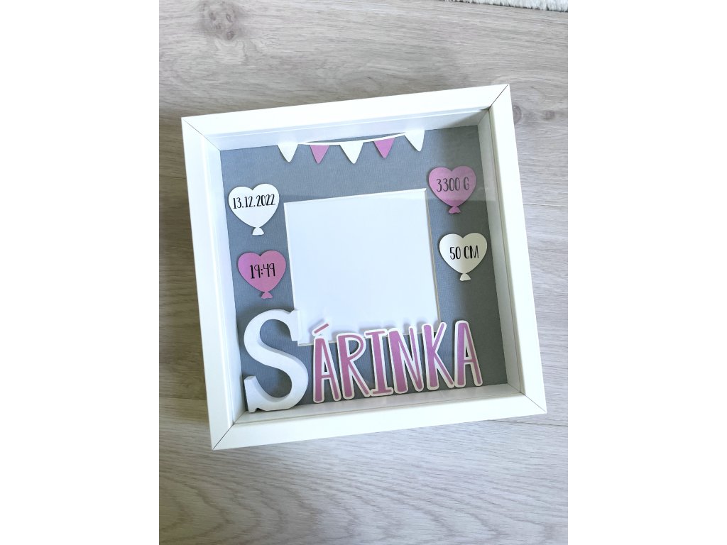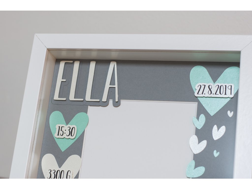 Dekorace do dětského pokoje, rámeček se jménem a daty narození.