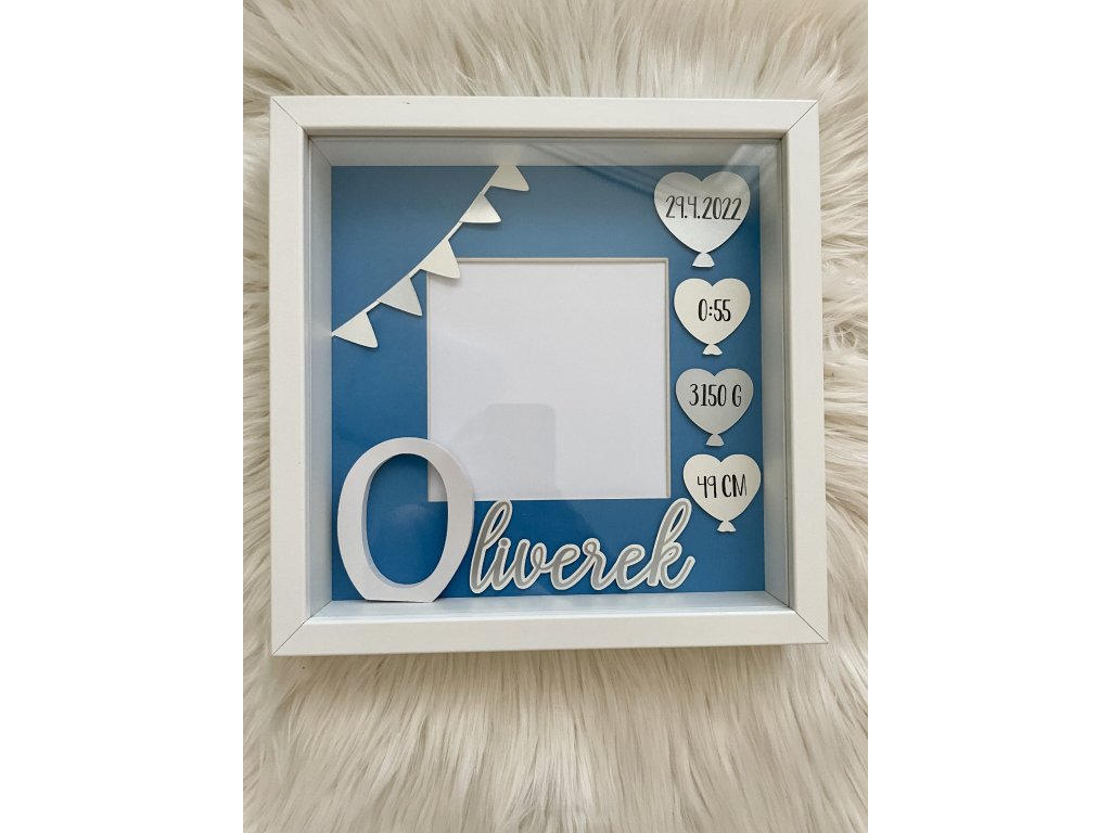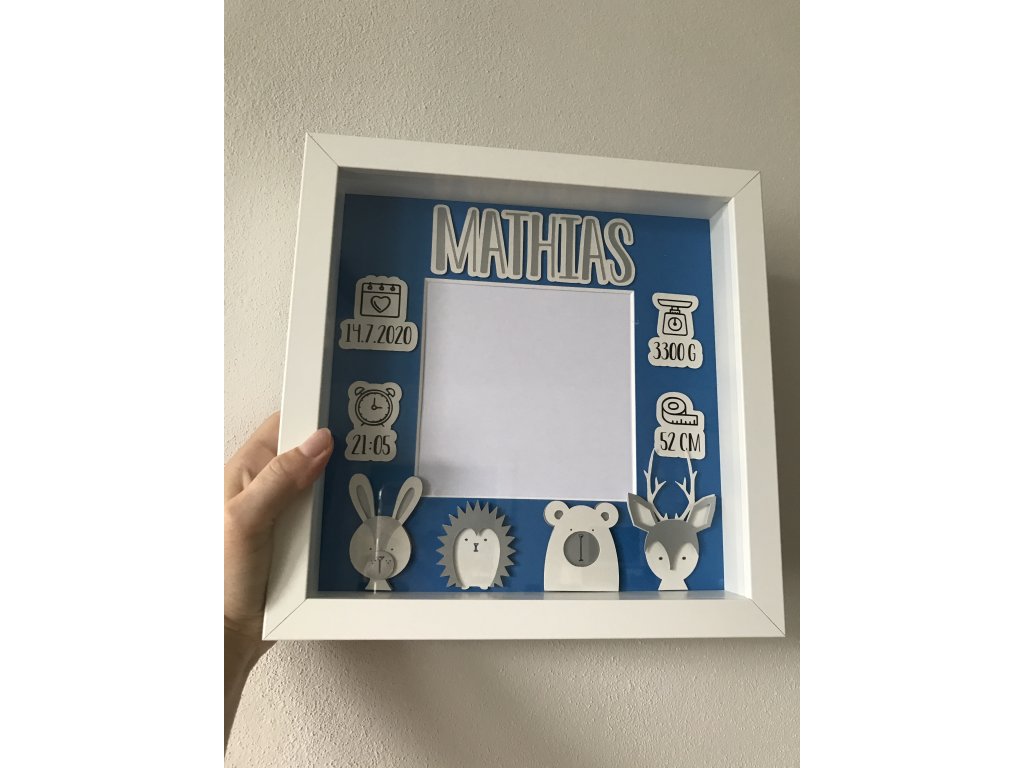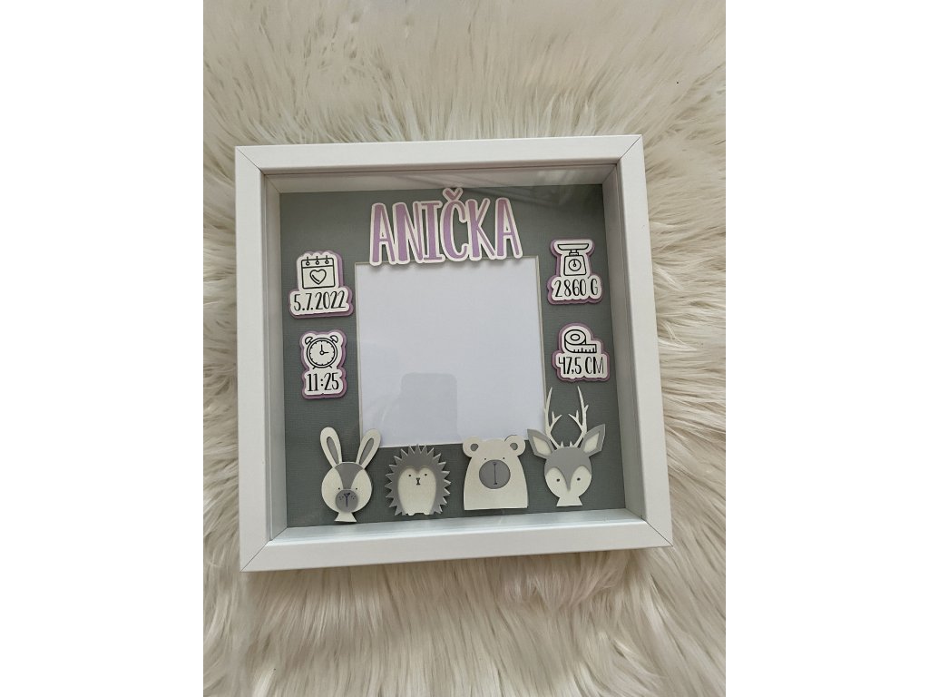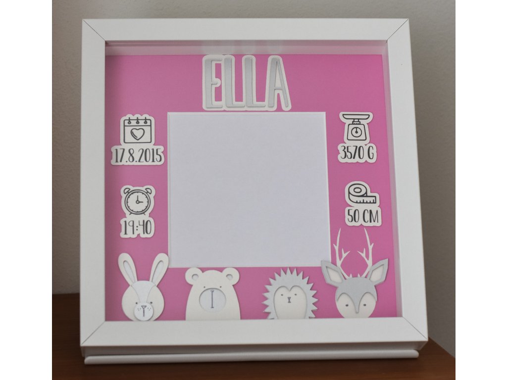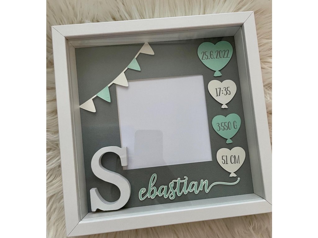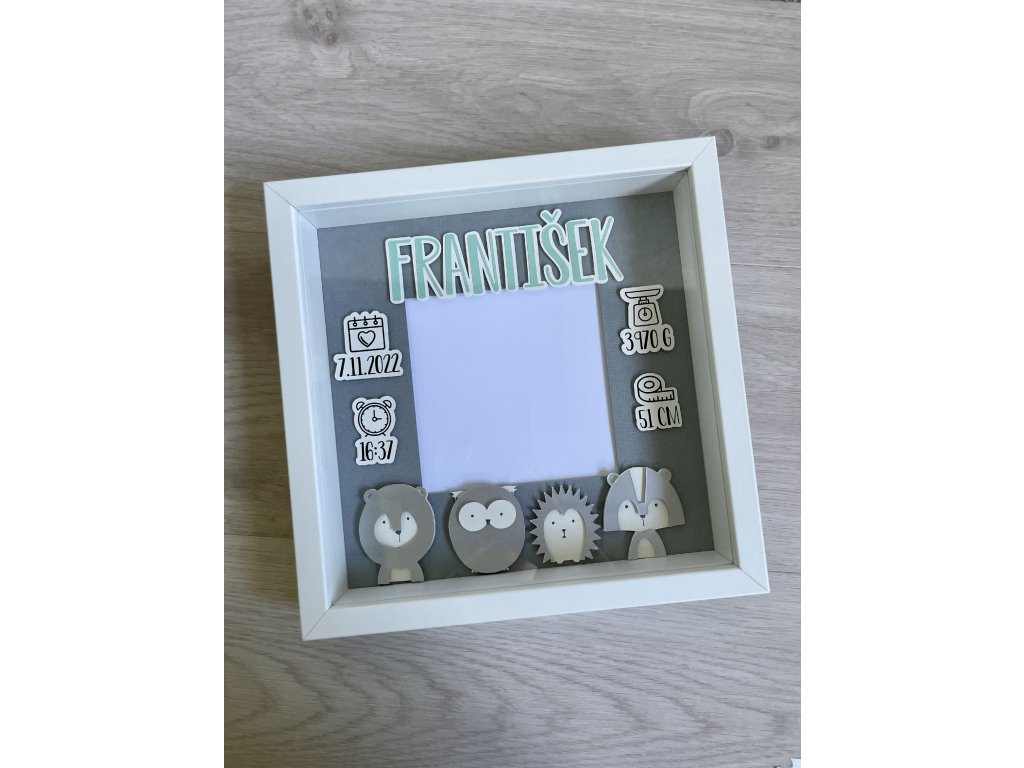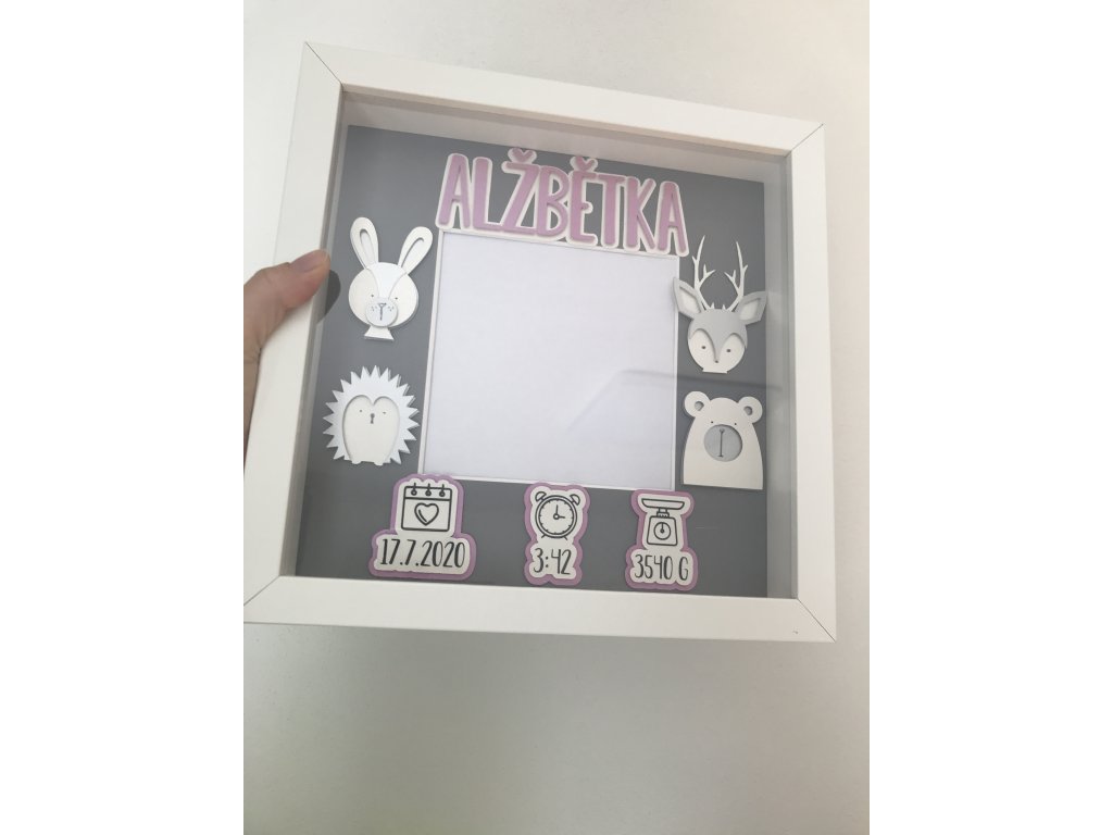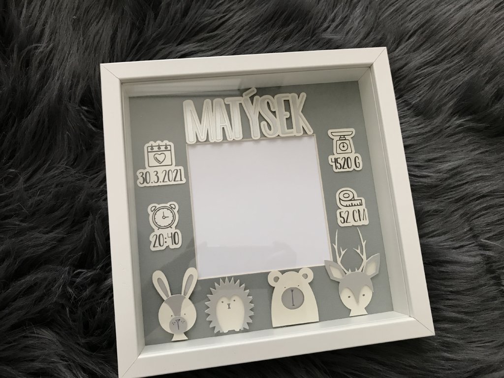 Dekorace do dětského pokoje, rámeček se jménem a daty narození.