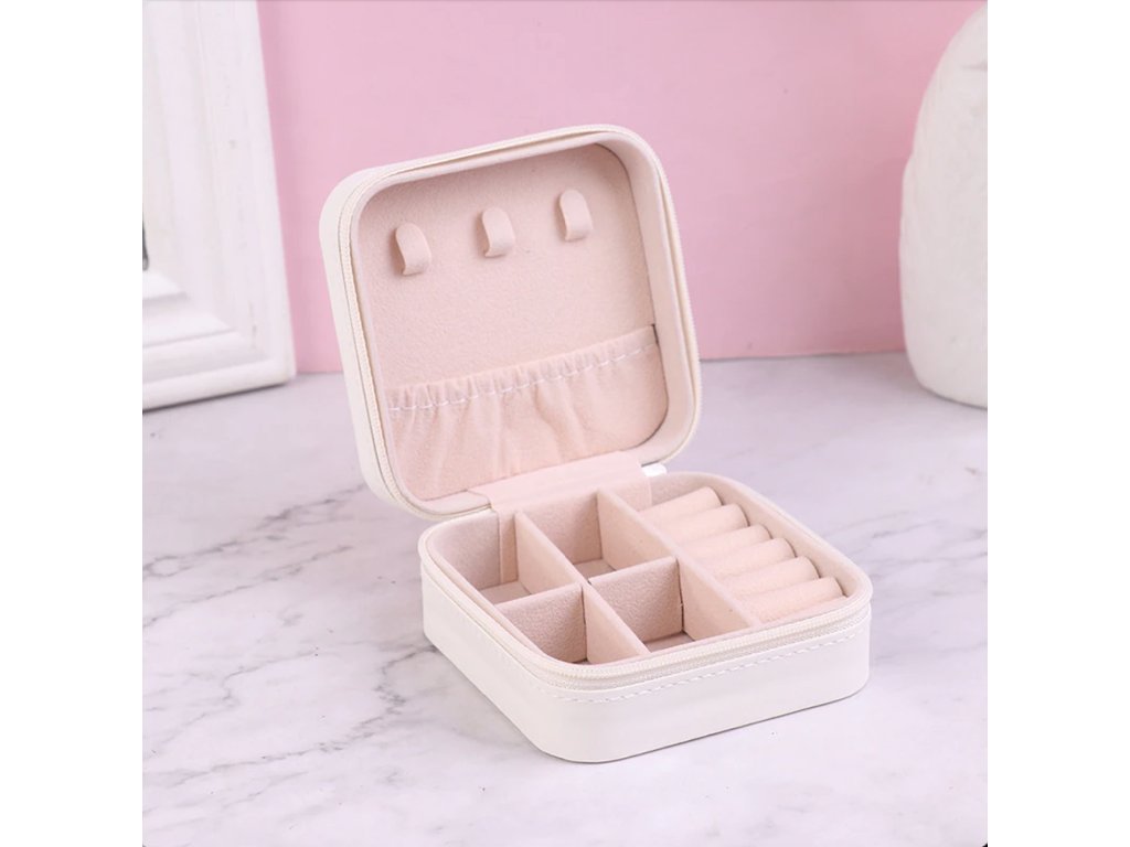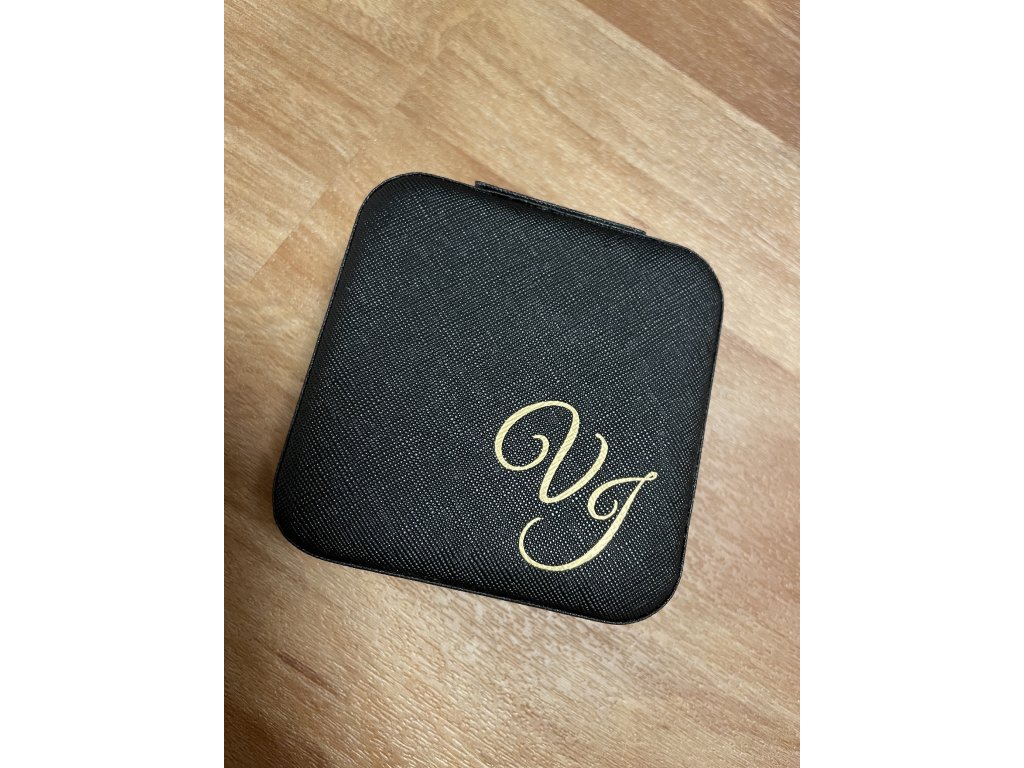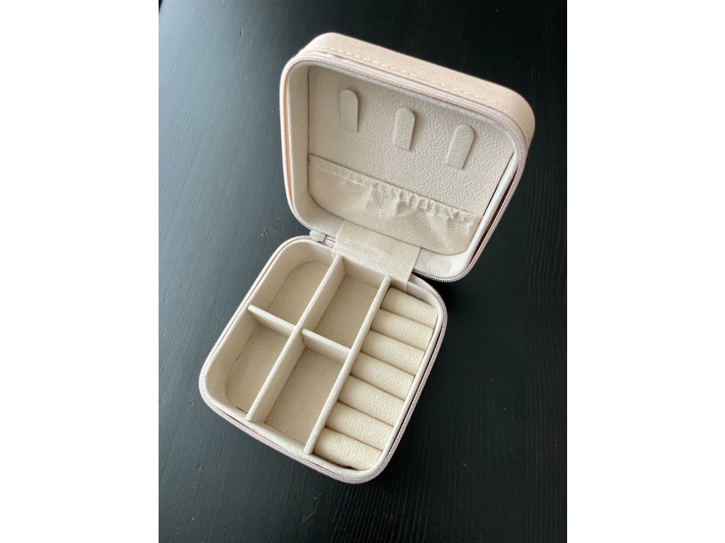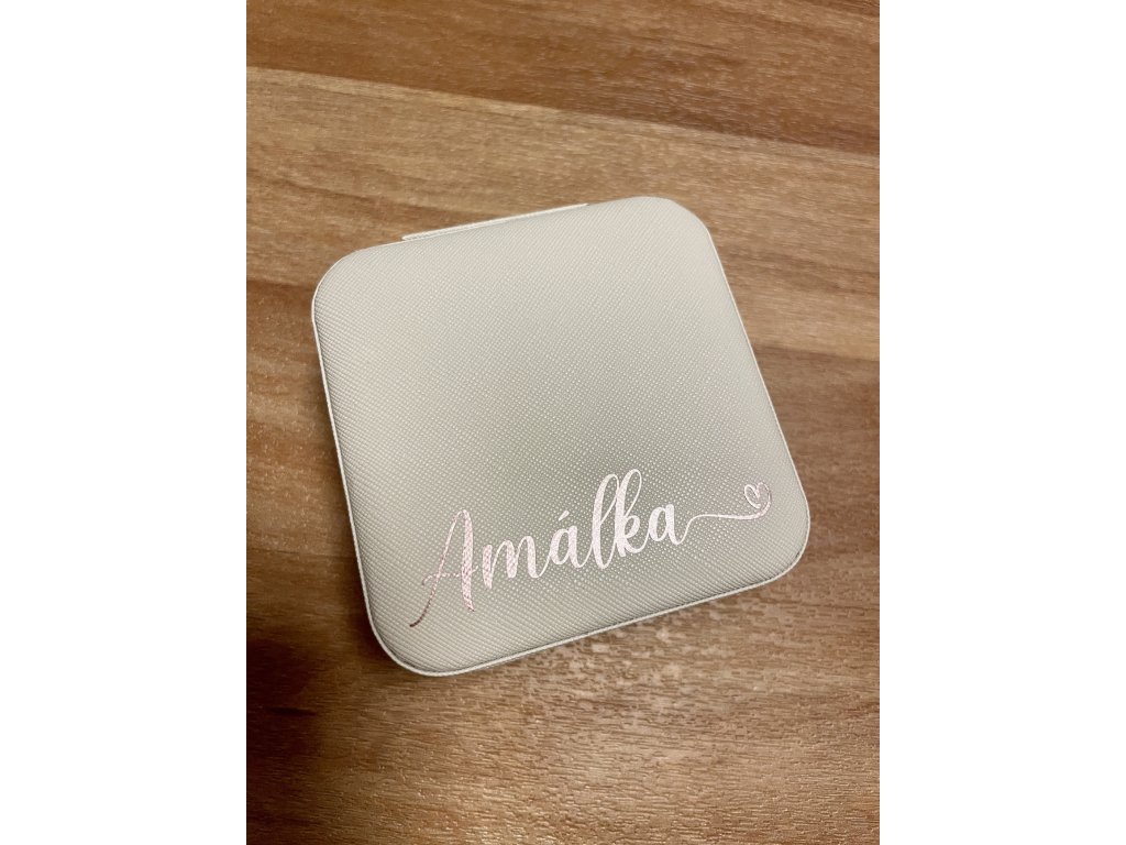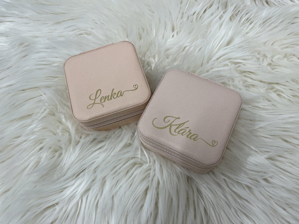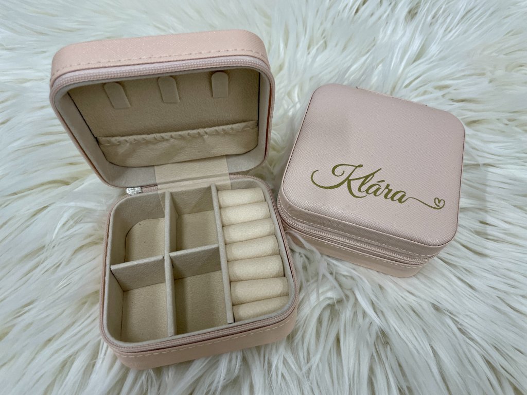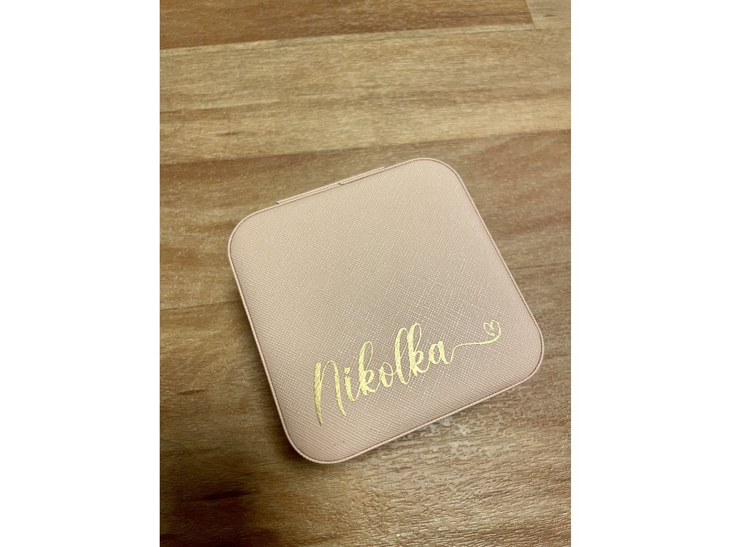 Malá příruční/cestovní šperkovnice se jménem na přání, vhodná na uschování náušnic, prstýnků a řetízků.